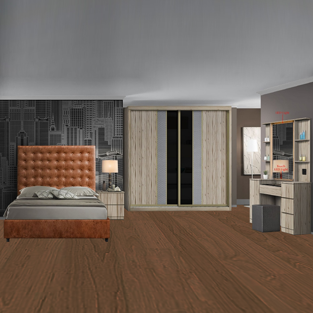 NT 8608B (8×8), includes wardrobes, 5′ bed with 10″ box base, and wide dresser