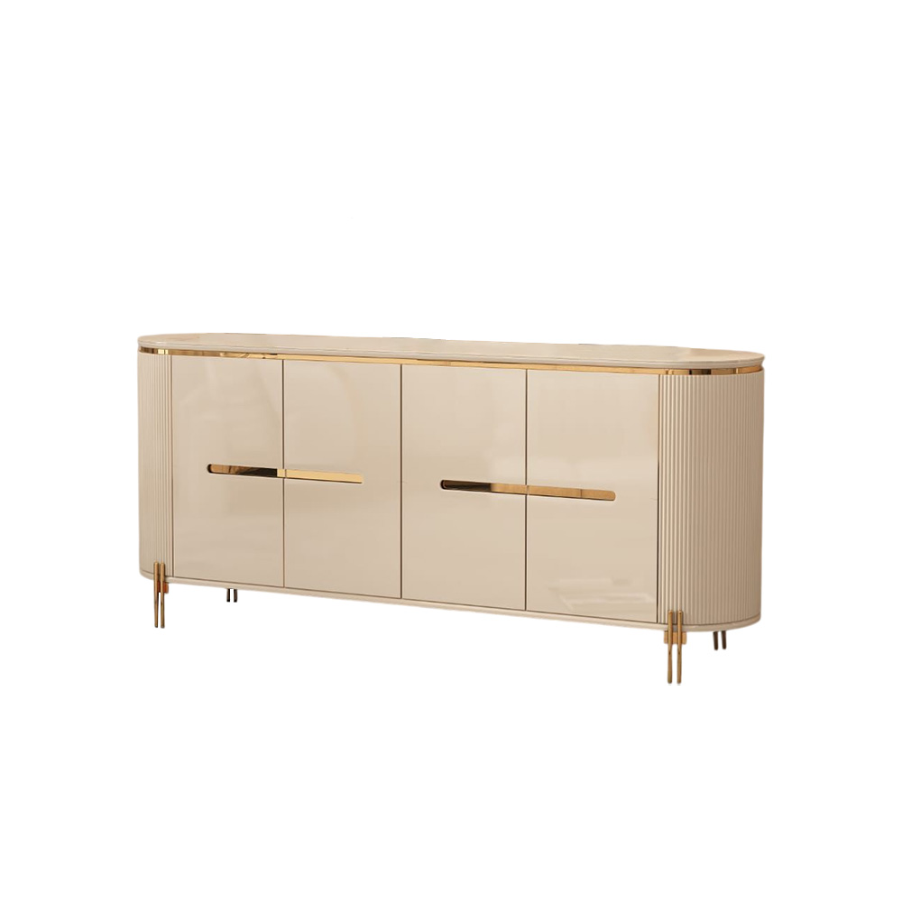 A luxurious addition to any dining space, this dining cabinet features a modern beige finish with stylish gold accents. With ample internal storage for dishes, utensils, and table linens, it combines elegance with functionality. The sleek profile and refined detailing make it a centerpiece in contemporary or minimalist dining rooms.