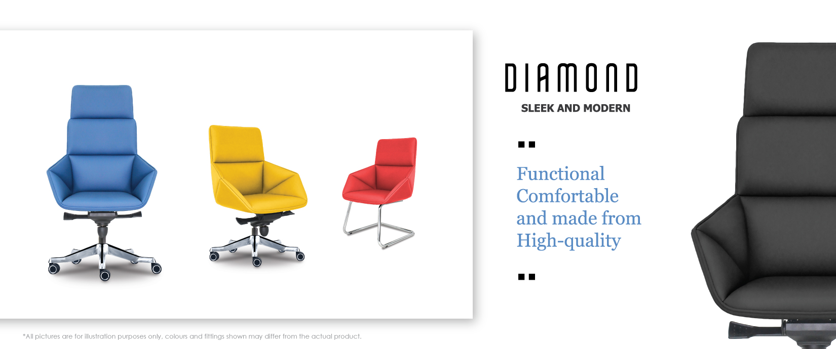 The Diamond Series blends streamlined style with ergonomic functionality for today’s modern workspace. Its square contemporary aesthetic pairs with a robust aluminium “rocket” die-cast base, delivering both elegance and durability.